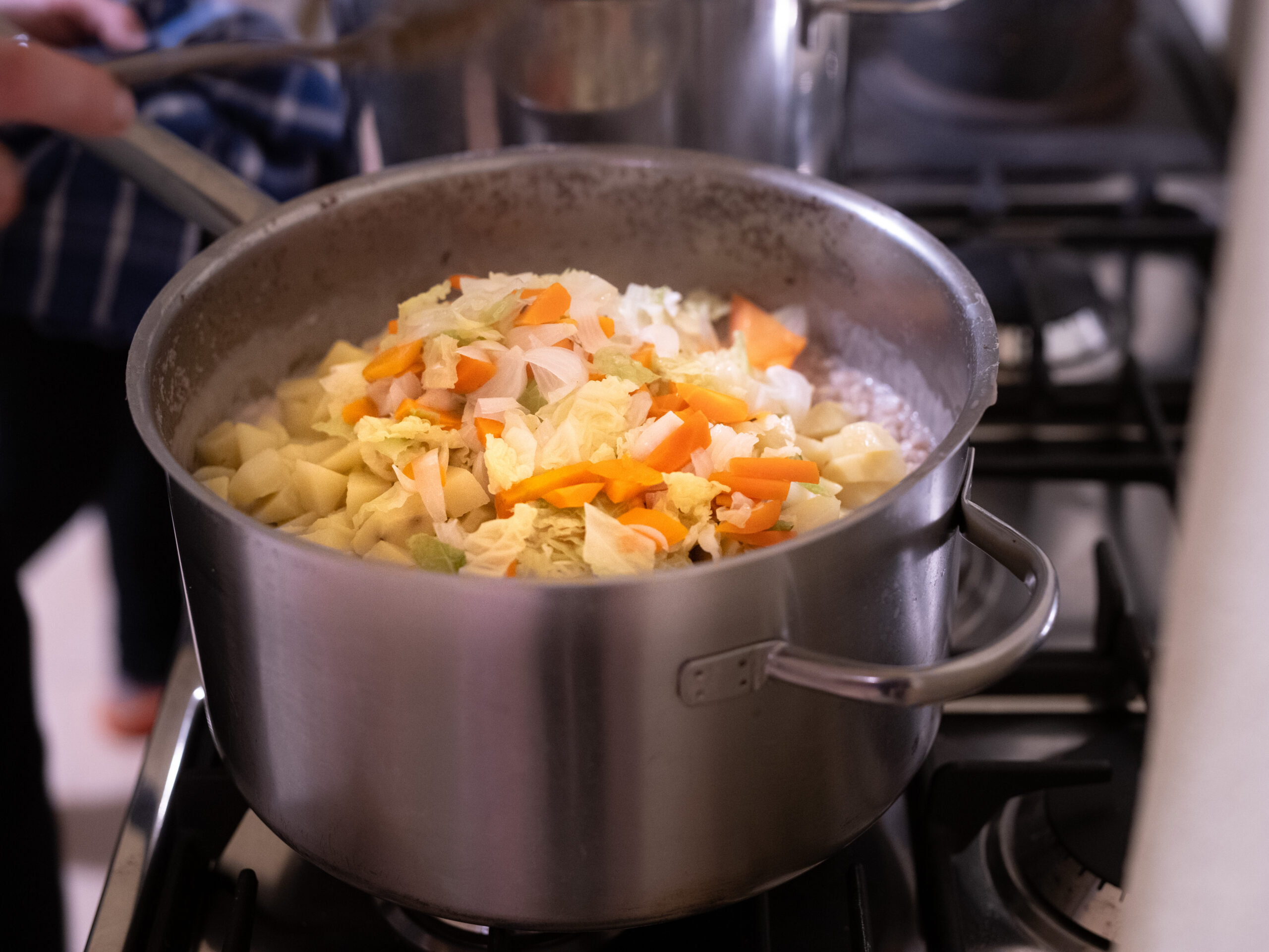 Zur Gerste gesellt sich nun das Gemüse, das in eine wohl überlegte Form geschnitten wird und auch separat gekocht wird. Der traditionelle „Eintopf – alles in einem Topf“ erhält nun eine differenzierte Note und die Esser erleben später freudig die verschiedenen Farben, Formen und Aromen des Gerichts. Ihre Aufmerksamkeit wird nach außen zur Wahrnehmung der Speise gelenkt und somit wird die Atmosphäre „lichtvoller“, kommunikativer und in diesem Sinne heilsamer.
