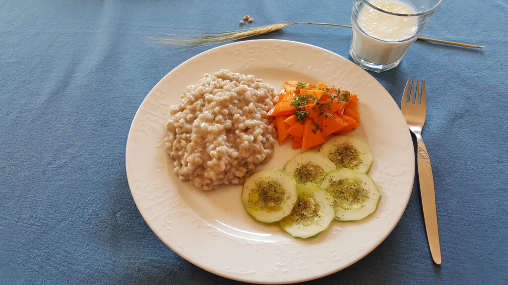 Um eine bestmögliche Bekömmlichkeit zu erzielen, bin ich beim Kochen der Gerste folgendermaßen vorgegangen: 70g Gerste pro Person mit 3,5 – 4 facher Wassermenge ( je nach Gerstenqualität, 4 -fach bei Nacktgerste) am Vorabend einweichen.