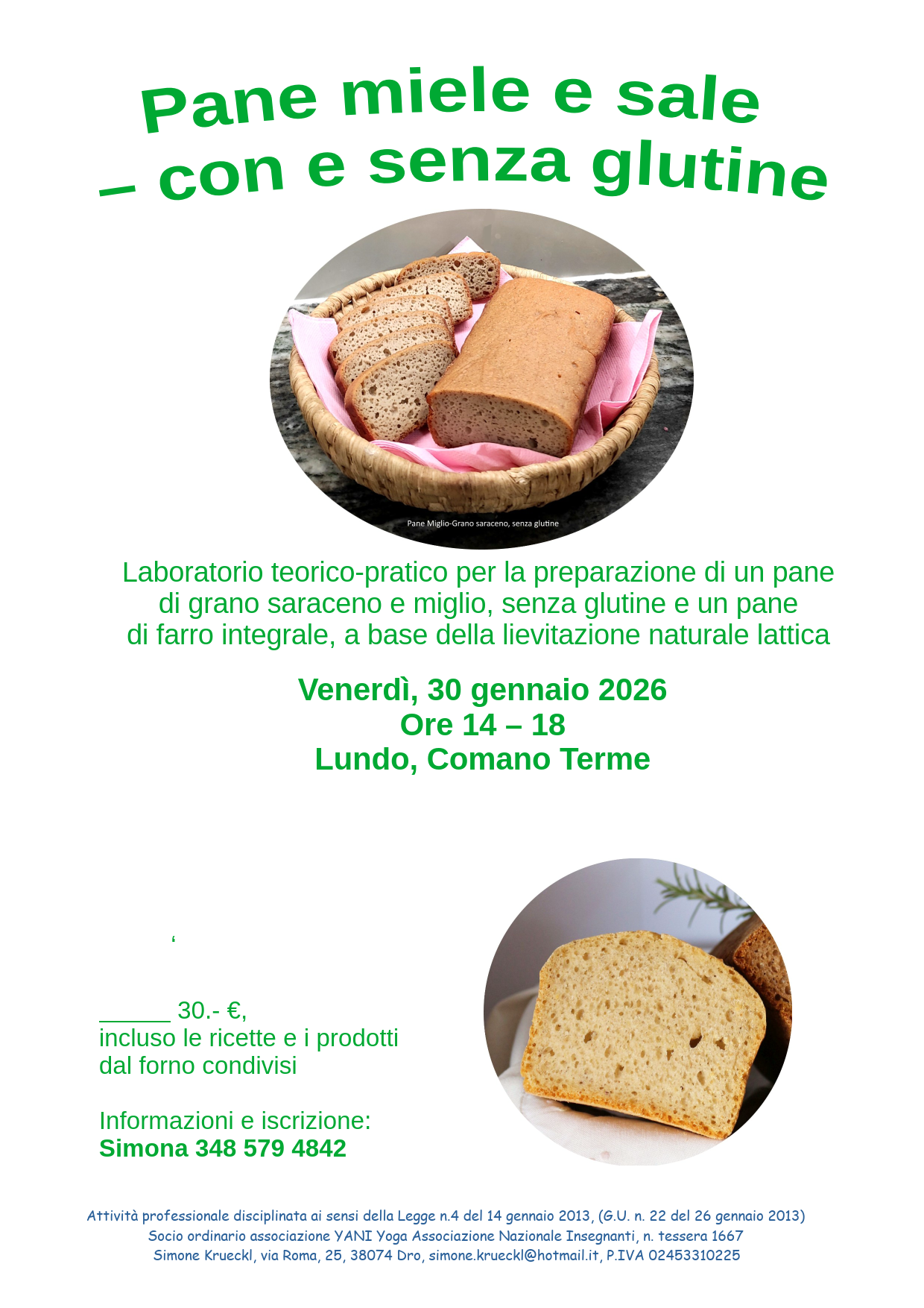 Venerdì, 30 gennaio 2026, ore 14 – 18: IL PANE MIELE SALE, CON E SENZA GLUTINE. Chi soffre di intolleranza al glutine, fa fatica trovare un pane gustoso, dato che proprio la glutine permette di creare la “maglia gluteica” nel pane. In questo pomeriggio vogliamo conoscere meglio la fermentazione naturale a base di miele e sale, la cosidetta fermentazione lattica. Prepariamo insieme due tipi diversi del PANE DI GRANO SARACENO E MIGLIO, una volta a base del BackNaturFerment e una volta a base di miele e sale. Inoltre prepariamo un pane di FARRO INTEGRALE e approfondiamo le nostre conoscenze pratiche nell’arte di fare il pane. Il costo di 30.- € include le ricette e un piccolo spuntino finale. Informazione e iscrizione: Simona, 348 579 4842